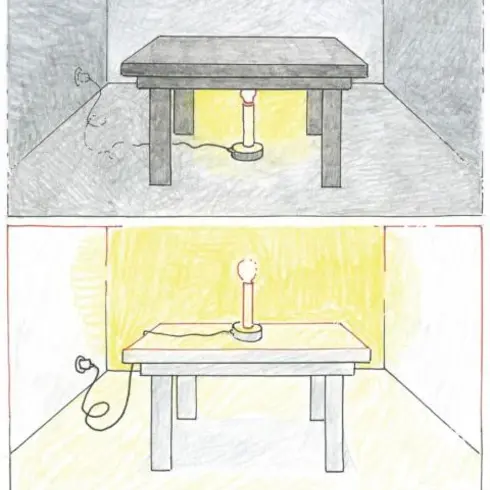 Die Lampe leuchtet für alle Leute im Zimmer.
